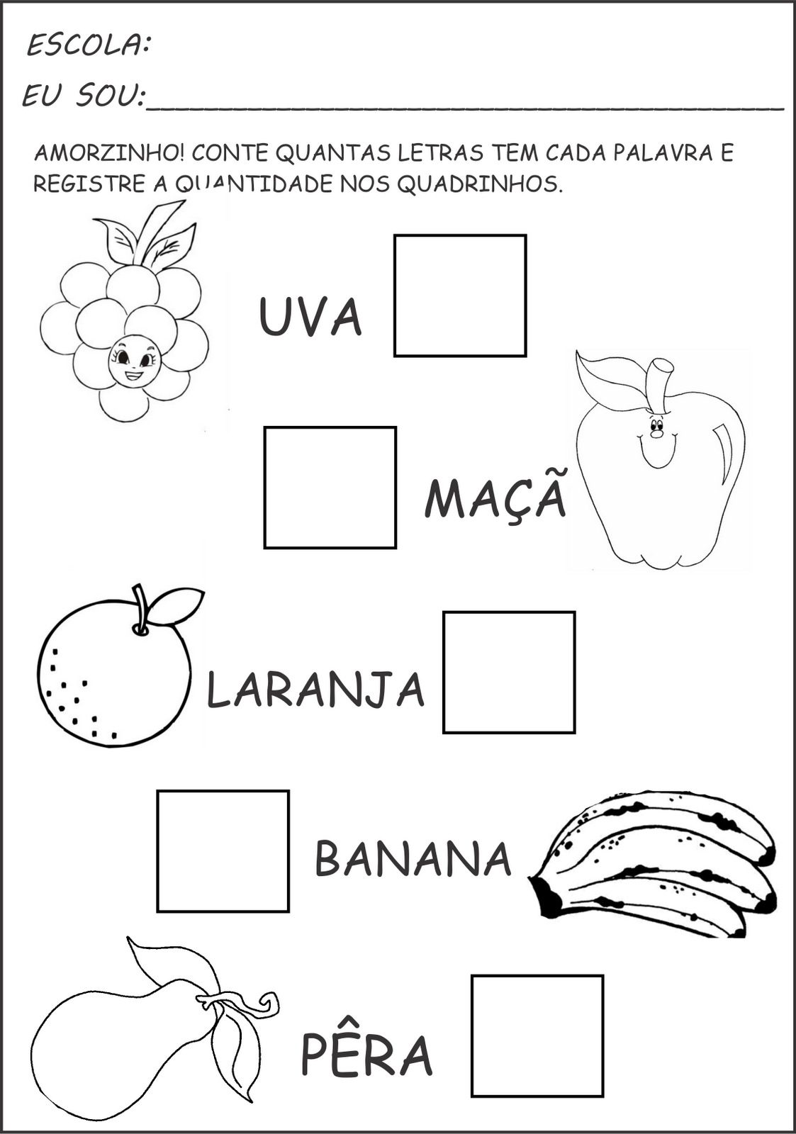 - A 5ª atividade para educação infantil é para contar quantas letras tem cada palavra e registrar a quantidade nos quadrinhos.