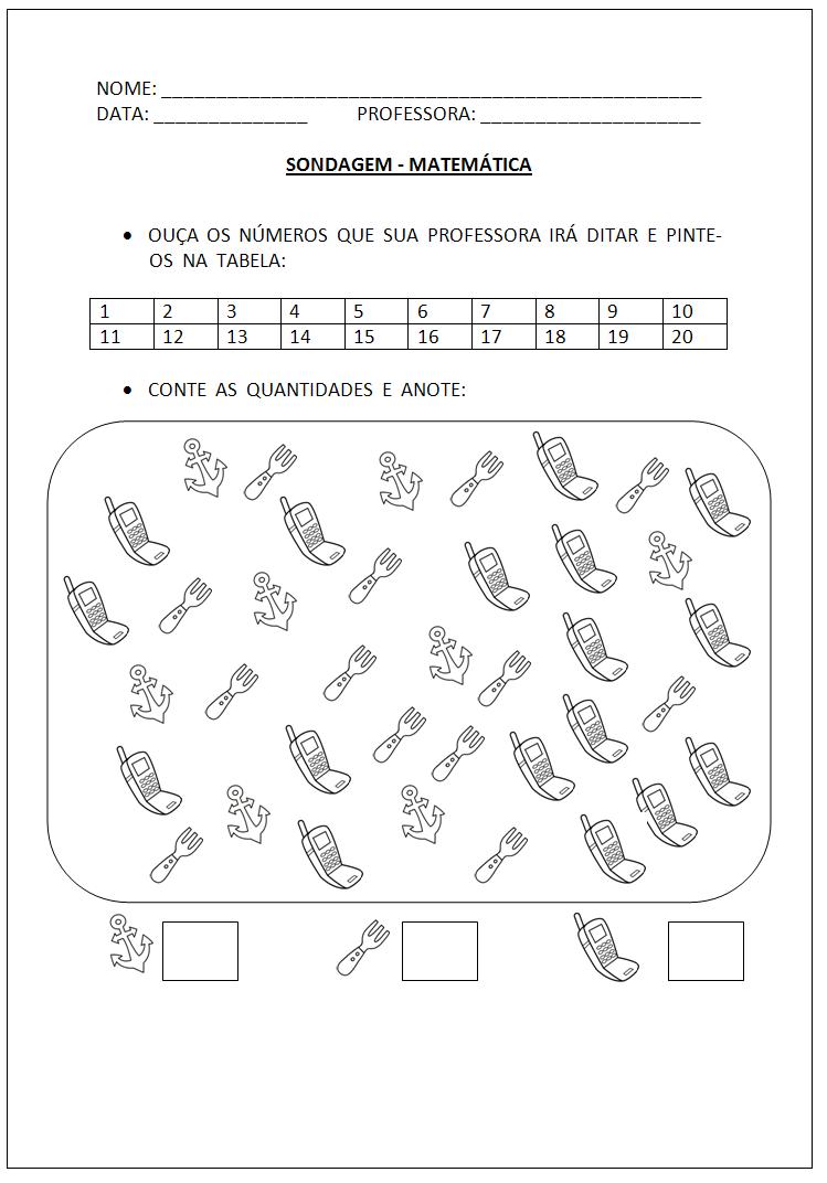 Segue uma sondagem de matemática para o 1° ano do ensino fundamental. São duas atividades 1° ano que podem ser usadas para sondar o nível de aprendizagem dos alunos.
