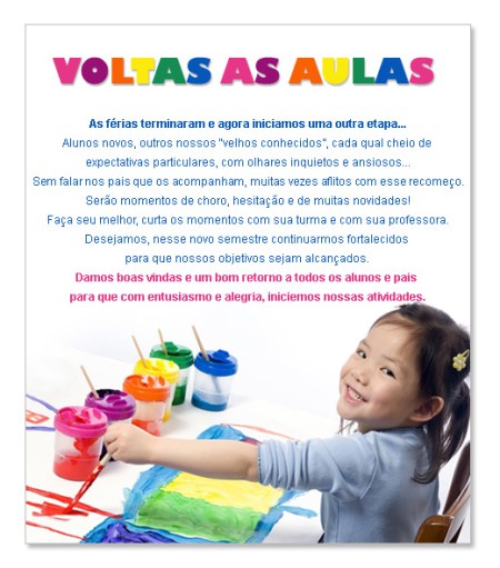 Fala um pouco sobre o que pretende ensinar durante o ano ou semestre, se achar conveniente, leve impresso ou passe na lousa para copiarem se achar necessário, isso somente para os mais velhos. Fale sobre os trabalhos escritos, provas e materiais que serão utilizados, se não foram solicitados antes do retorno às aulas.