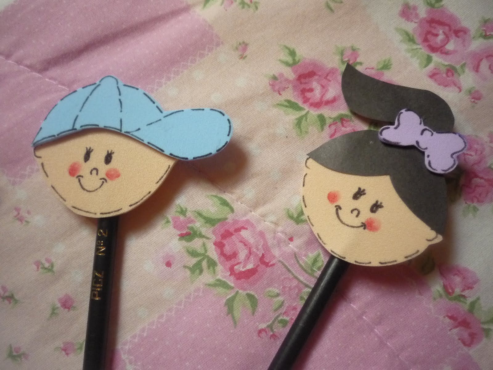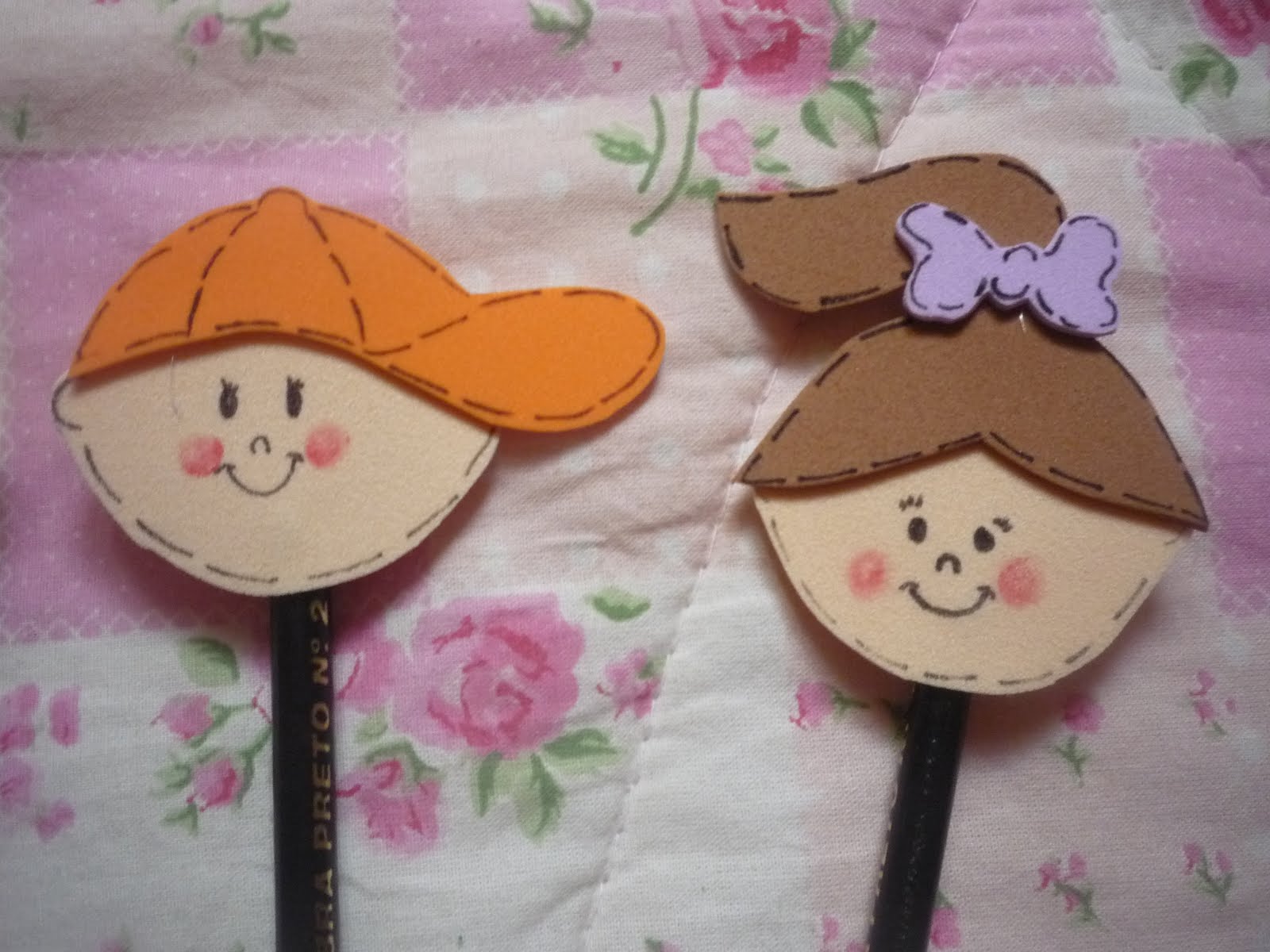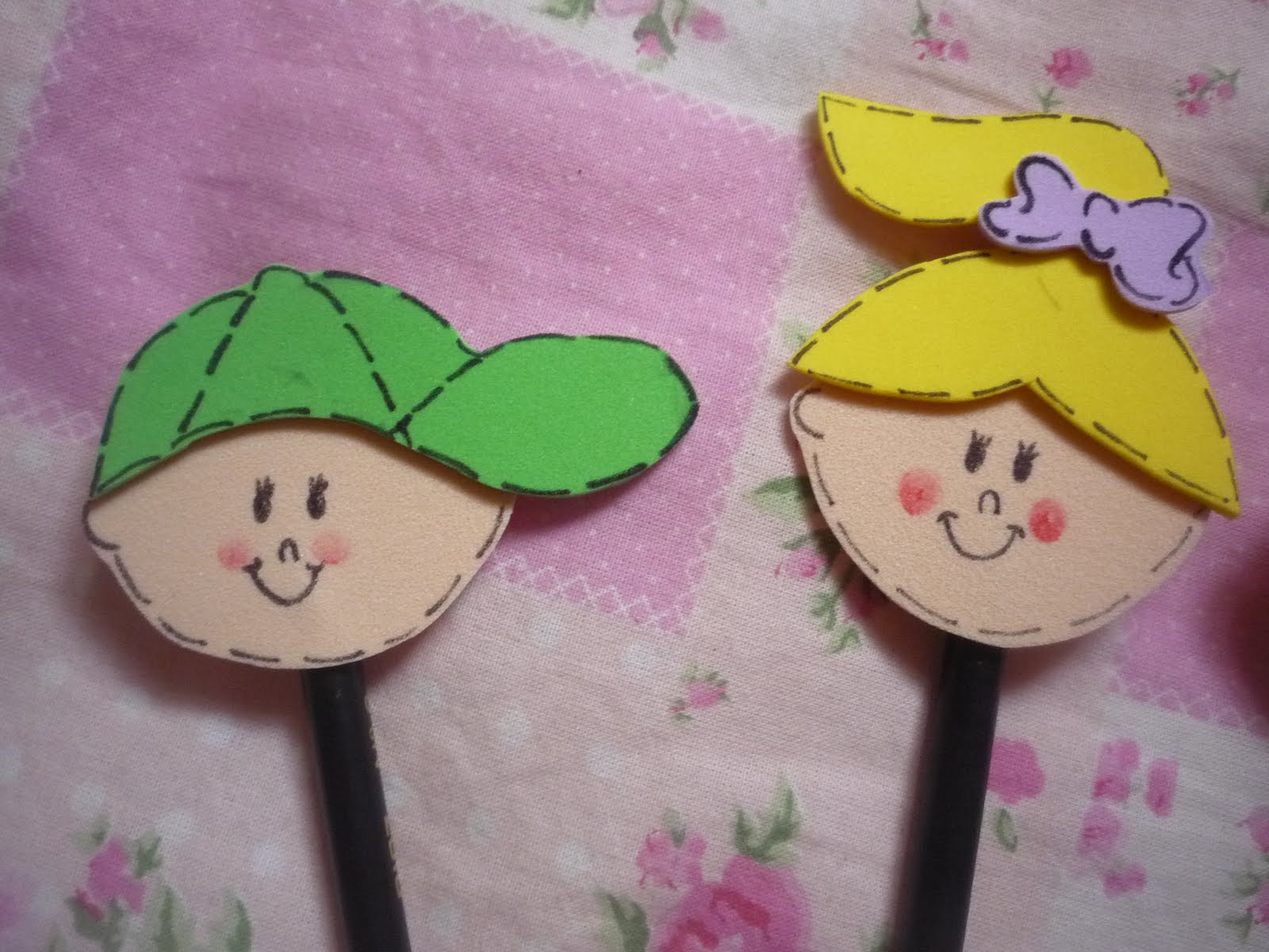 lembrancinha para os alunos com lápis e rostinho de menino e menina em EVA.