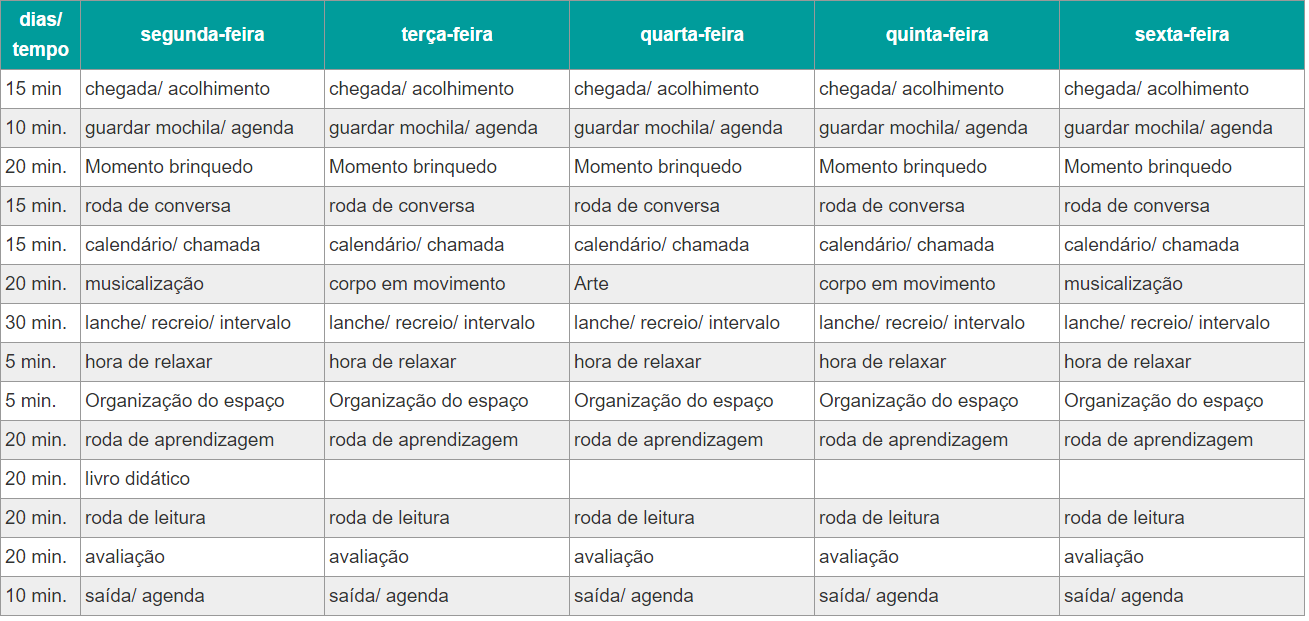 Sugerimos a seguir um modelo de rotina que poderá ser adaptada ao cotidiano da escola. Cabe ressaltar ainda que a rotina deve estar em consonância com o projeto político-pedagógico da escola, levando em conta a idade do grupo, os espaços disponíveis e a realidade local.