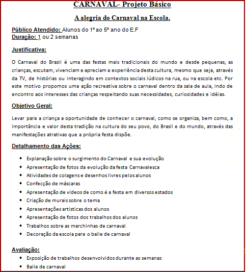 Levar para a criança a oportunidade de conhecer o carnaval, como se organiza, bem como, a importância e valor desta tradição na cultura do seu povo, do Brasil e do mundo, através das manifestações atrativas que a própria festa dispõe.