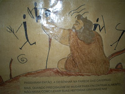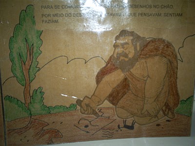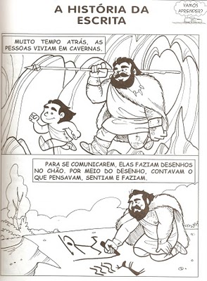 Antes de contar a história da escrita aos alunos, incentivá-los a imaginar como os homens das cavernas faziam para escrever e contar. Vamos tentar escrever como os homens das cavernas – usando símbolos?! Contar a história e mostrar o livro as crianças. Relembrar as crianças os filmes que já viram que tinham gravuras nas pedras ou no interior das cavernas.