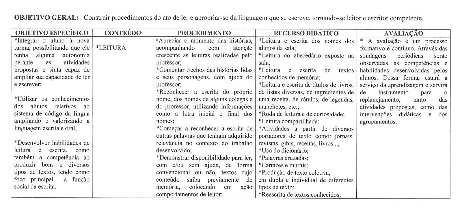 Objetivo Geral deste planejamento é construir procedimentos do ato de ler e apropriar-se da linguagem que se escreve, tornando-se leitor e escritor competente.