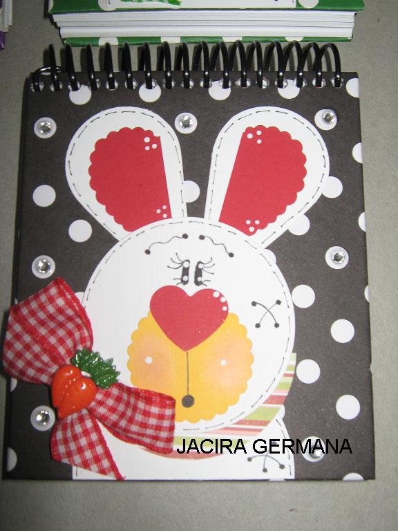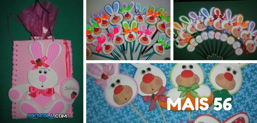 As criações vão desde ponteirinhas de lápis a potinhos de amendoins, sacolas de coelhos da Páscoa, bloquinhos de anotações, canetas decoradas, sacolinhas de TNT com molde de coelhinha de páscoa, e muito mais!