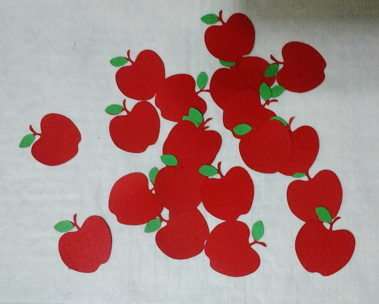 As maçãzinhas foram compradas em uma loja de artigos para bijuteria, mas você pode usar qualquer círculo vermelho, por exemplo, de plástico, EVA ou papel.