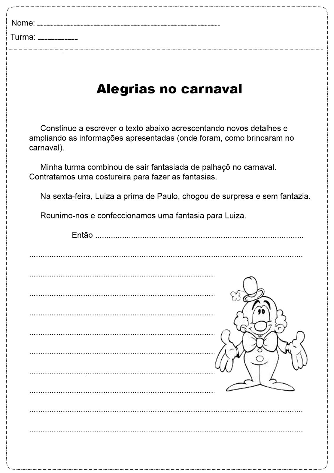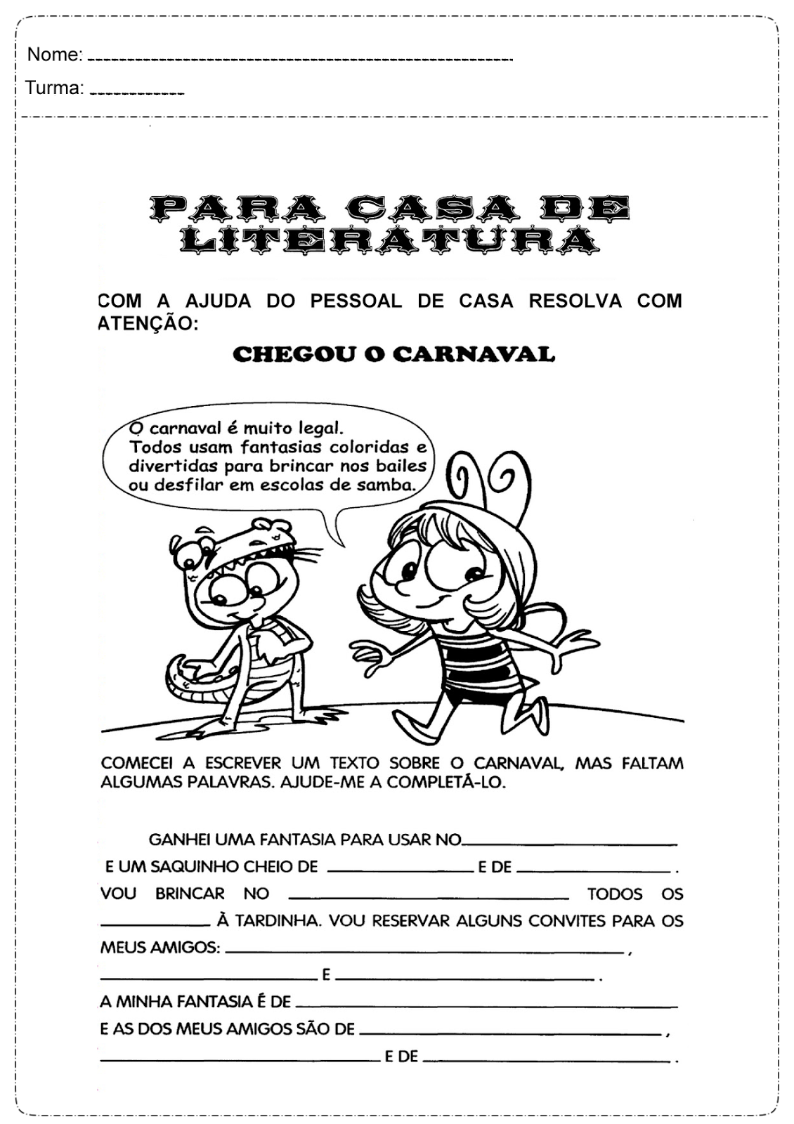 Texto sobre o carnaval: Veja as atividades carnavalescas onde o aluno irá completar o texto sobre o carnaval sendo muito interessante para despertar o raciocínio da criança, os exercícios estão prontos para ser impresso e aplicado em sala de aula.