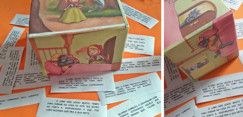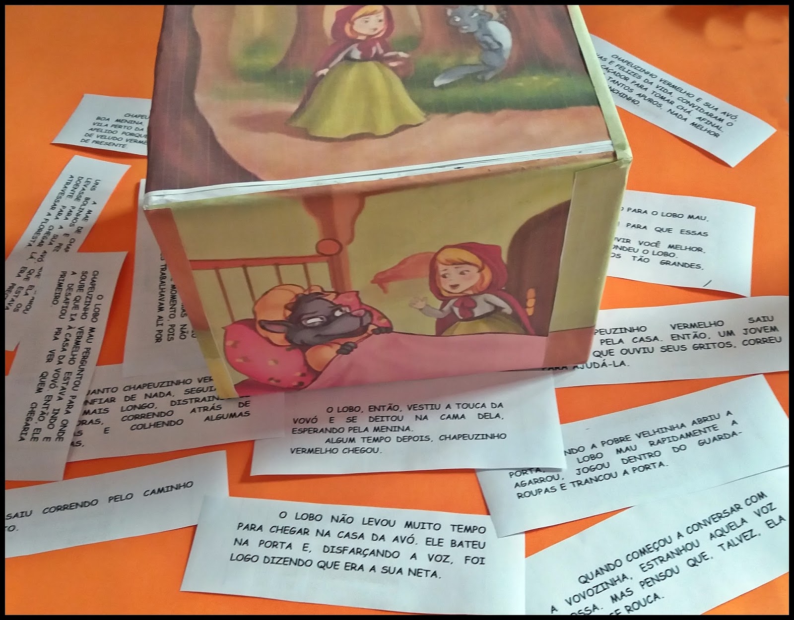 Organize a sala em um grande círculo e faça sorteios de um aluno por vez para jogar o dado e falar qual parte da historia apareceu. O aluno deverá contar a cena da história em voz alta juntamente com a turma e o professor fará o registro na lousa. No final do jogo quando todas as faces do dado forem sorteadas a turma escreve a sequência correta da história no caderno. Para finalizar a ação a professora distribui em grupos a história (Chapeuzinho Vermelho) fatiada, para que realizem a leitura e montem a sequência.