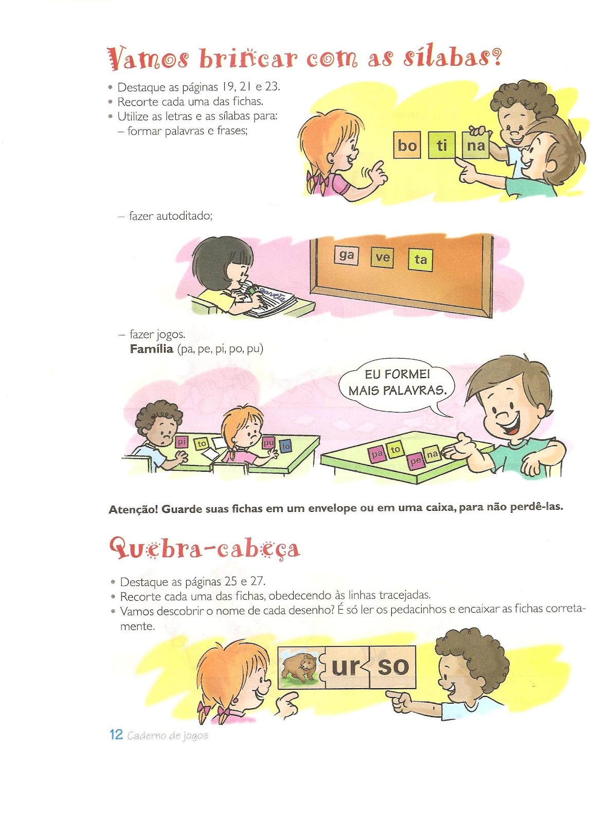 Utilize as letras e sílabas para formar palavras e frases. As fichas podem servir para autoditado, família das sílabas.