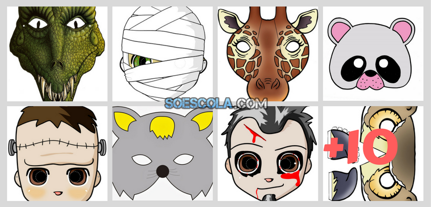 Na seleção abaixo, tem máscara colorida de dinossauro, máscara de girafa, máscara de coruja, máscara de coelho, máscara de onça, máscara de vampiro, máscara de urso, máscara de zumbi, máscara de sapo, máscara de raposa, máscara de múmia, máscara de Frankestein, e máscara da Minnie. Com certeza, você vai gostar de alguma(s) para trabalhar com seus alunos.