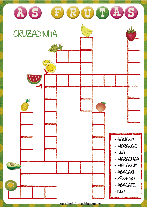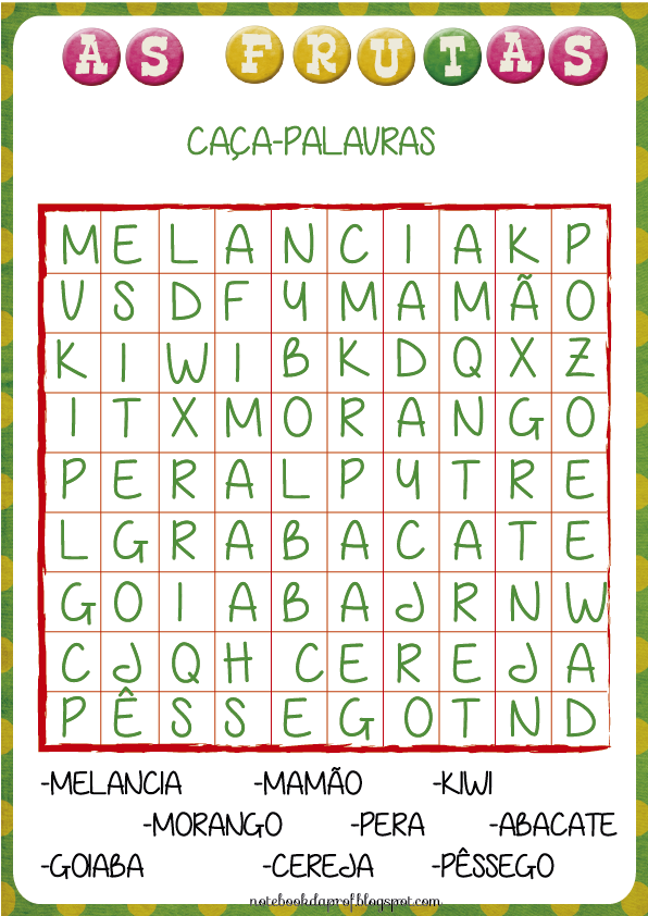 Cards de frutas com nome. Esses cards servem como jogo da memória (imprimindo cada folha duas vezes), como cartões de apresentação de cada fruta, e como controle do erro para o jogo de correlação de nome e imagem que postarei amanhã.
