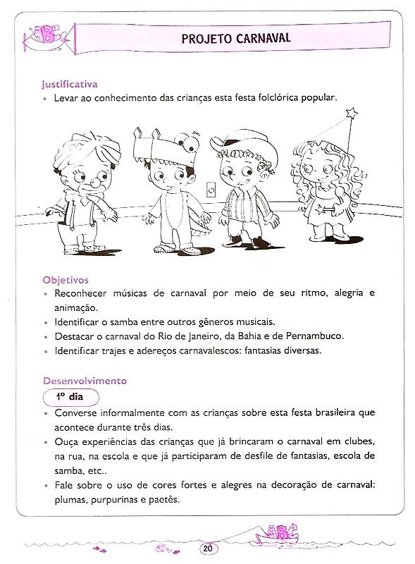 Olá amigos e amigas do SÓ ESCOLA. Nesta postagem trago para vocês uma sugestão de projeto sobre o carnaval com o objetivo de reconhecer músicas de carnaval por meio de seu ritmo, alegria e animação, identificar o samba entre outros gêneros musicais, Identificar trajes e adereços carnavalescos tais como fantasias e máscaras. Confira: