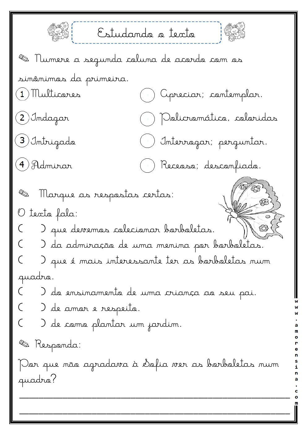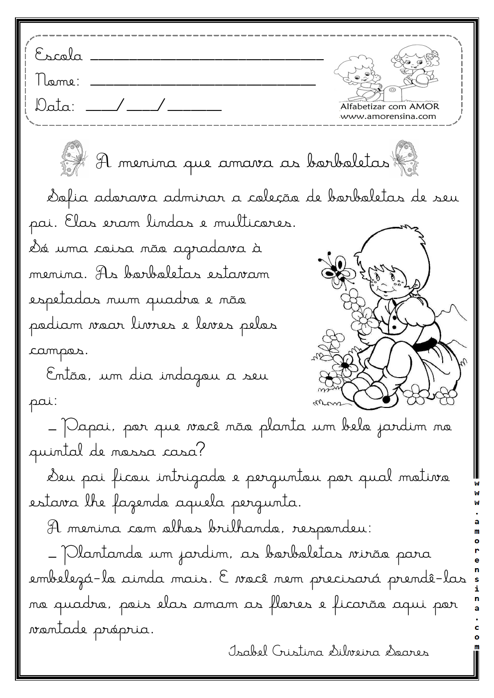 Olá amigos e amigas do SÓ ESCOLA. Nesta postagem trago para vocês Atividades prontas para Imprimir indicada para alunos do terceiro e quarto ano do Ensino Fundamental – A menina que amava as borboletas – Amor e Respeito aos Animais.