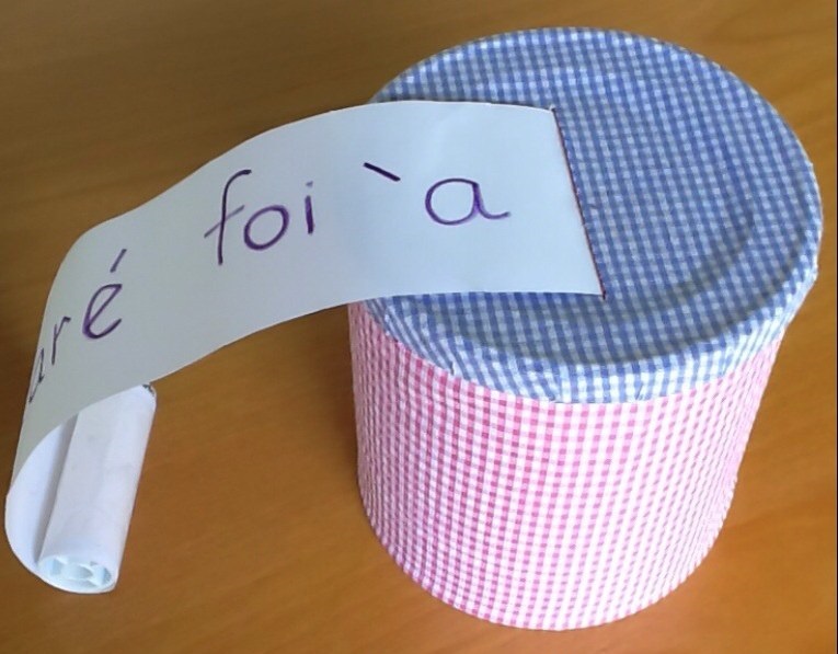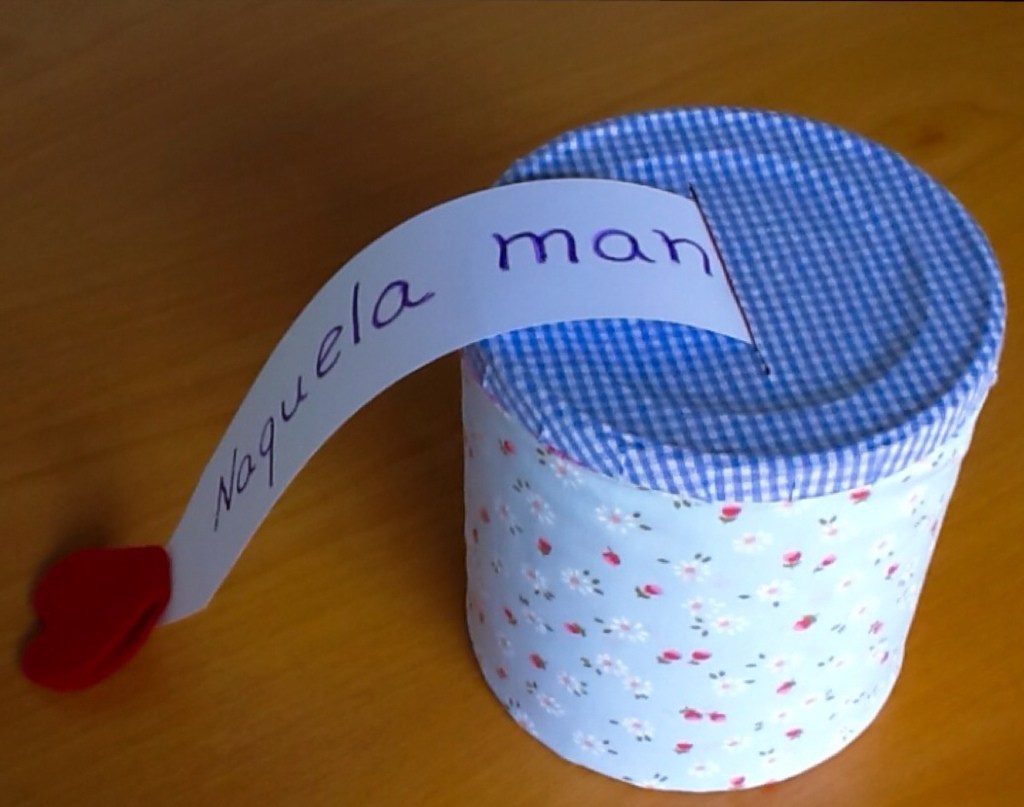 P.S.: Na ponta do papel que fica para fora da lata, ao invés do retrós, você pode colocar algo que a criança possa puxar o papel. Na lata que você vê na imagem ao lado eu colei um coração de feltro.