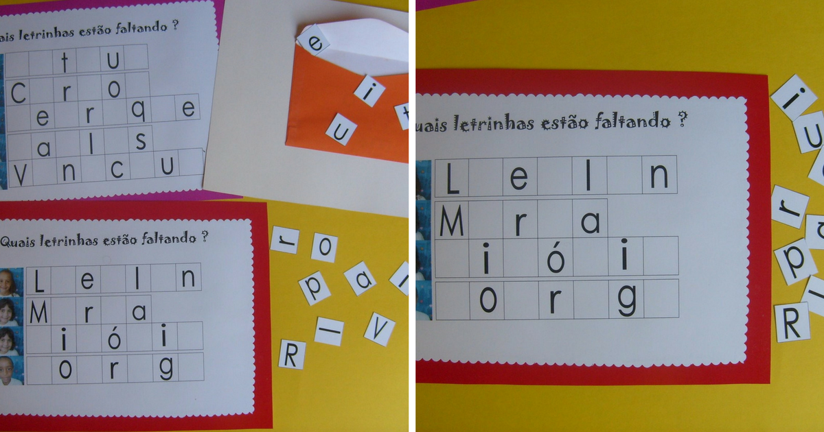 Componentes: Cartelas com fotos e o nome dos alunos faltando letras, envelopes com as letras que estão faltando nos nomes, colado atrás das cartelas.