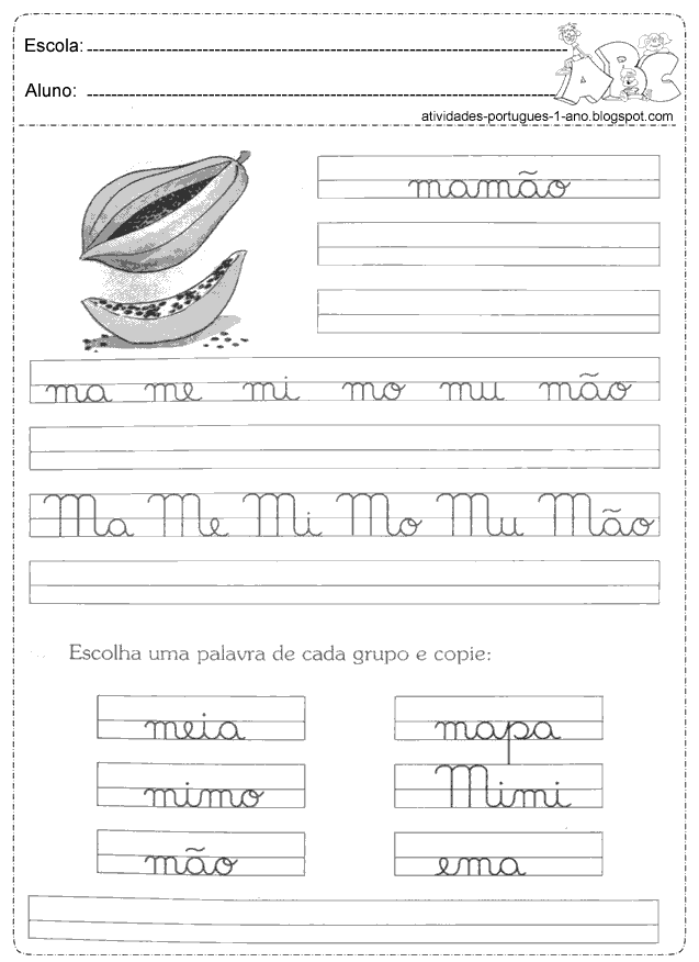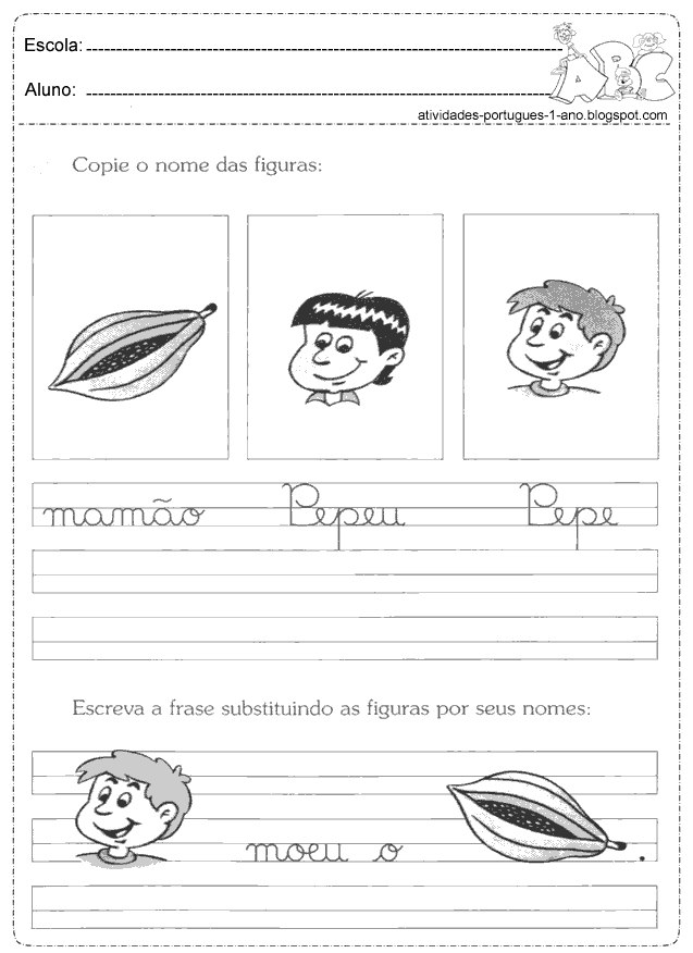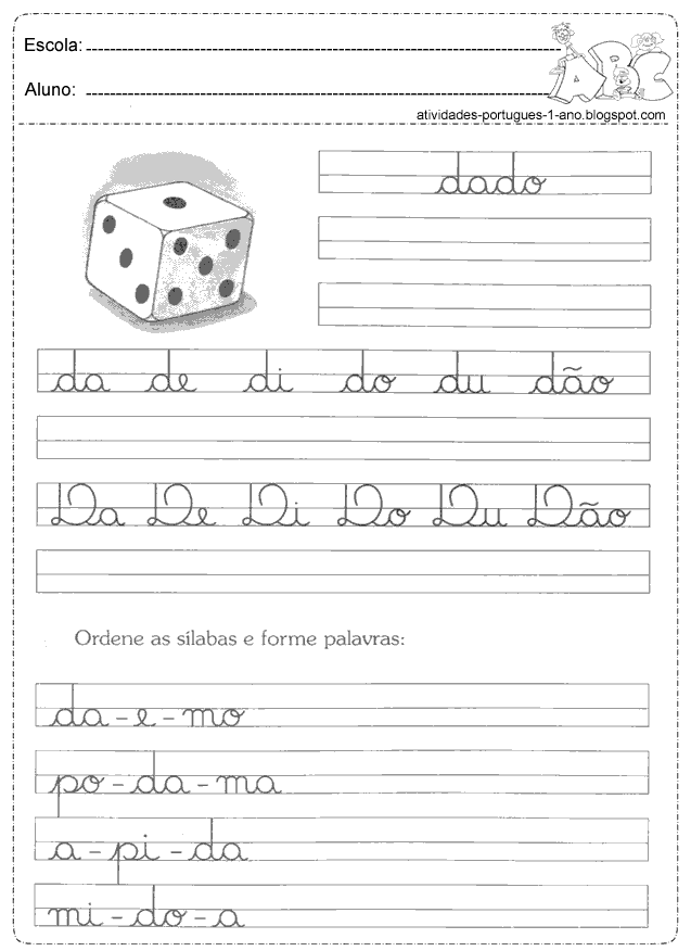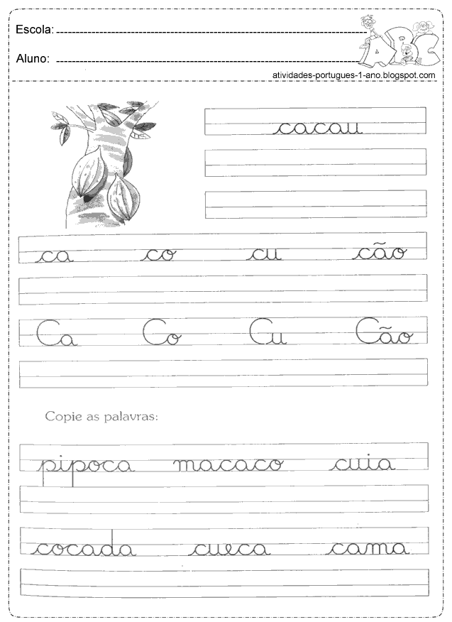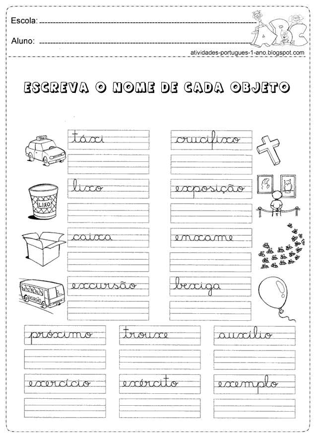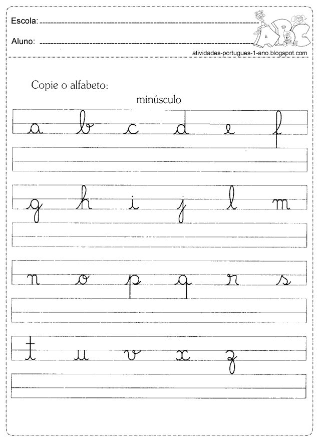 Atividades com letras cursivas, com exercícios de complete o alfabeto de A até Z, complete as frases com uma das palavras que está no quadro, copie as palavras da linha correspondente aos símbolos, ordene as silabas e forme palavras, cubra e copie a frase, escreva o nome das figuras e copie somente as palavras com 2 sílabas.