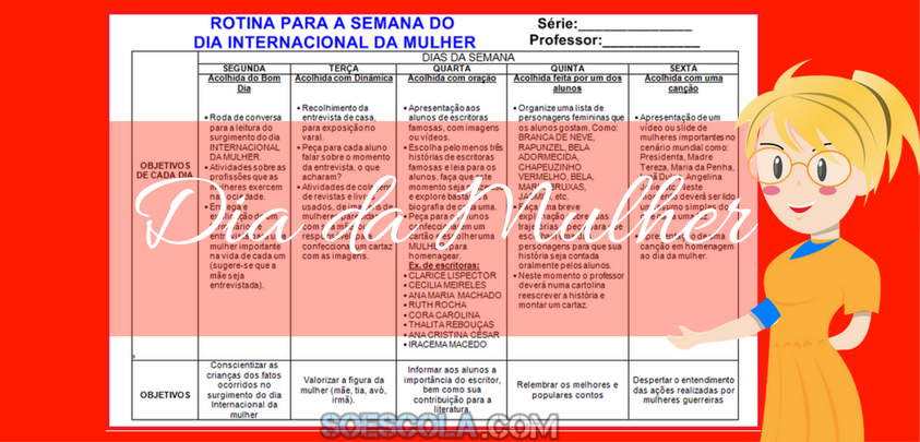 Olá amigos e amigas do SÓ ESCOLA. Nesta postagem trago para vocês uma sugestão de rotina para trabalhar o dia internacional da mulher para servir de base para vocês.