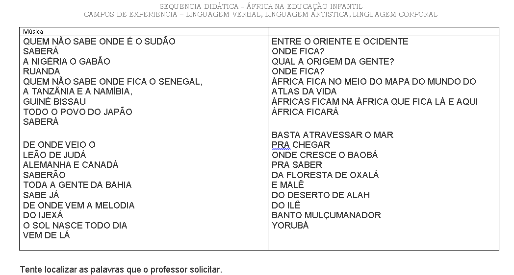 - Trabalhar a letra da música da palavra cantada na sequencia didática de linguagem verbal – pseud. leitura, localização de informações no texto, escrita de palavras no texto com letras móveis