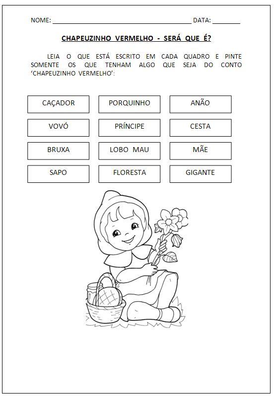 Segue algumas atividades prontas para imprimir do conto Chapeuzinho Vermelho para trabalhar Alfabetização Infantil.