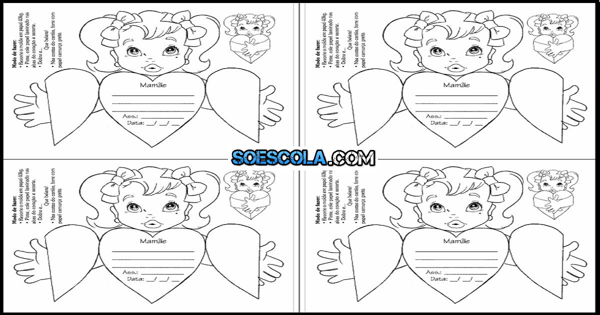 Confira nesta postagem um modelo de cartão para o Dia das Mães para colorir e recortar em formato de coração abre e fecha.