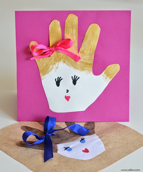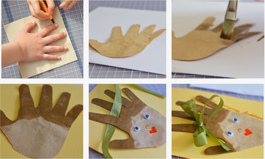 As mãozinhas foram riscadas e recortadas em papel craft e pintadas depois, você pode usar papel branco ou colorido também. Depois, pinte o cabelo da cor do cabelo da mamãe da criança, faça o rostinho e amarre um a linda fita no cabelo.