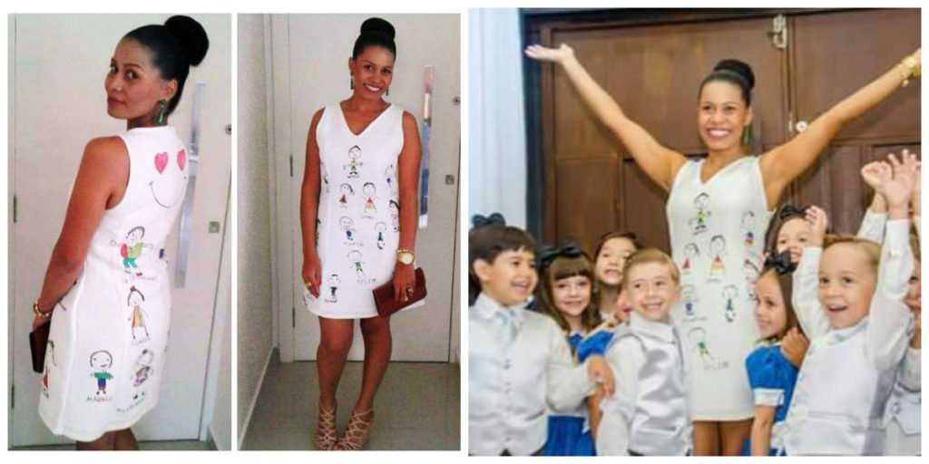 Ela escreveu para o Catraquinha contando a história de como escolheu seu vestido de formatura. “Este foi o meu look no dia da formatura das crianças da Educação Infantil. Cada criança fez um personagem no meu vestido para ilustrar o tema ‘diversidade cultural’, assunto trabalho no decorrer do ano”.