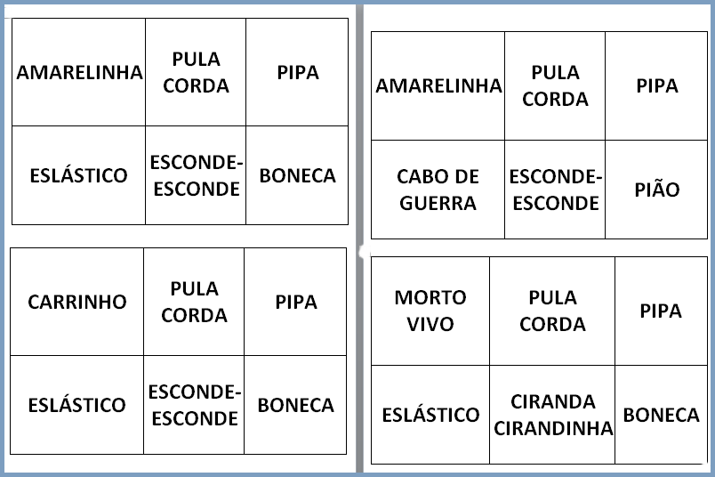 - Confeccione as cartelas para o bingo com nomes de brincadeiras;
