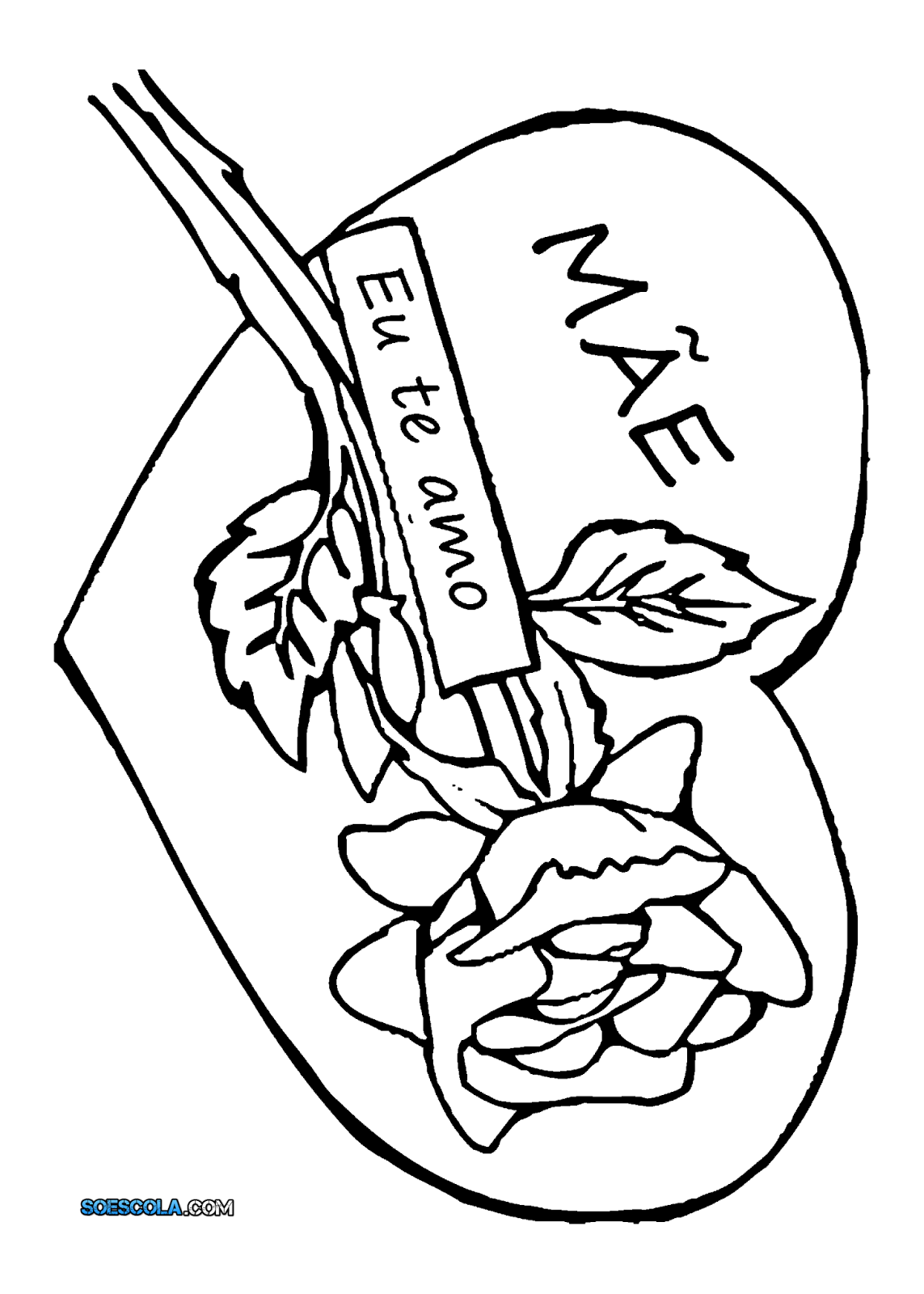 - Cartão simples para colorir com desenho de rosa e coração para o Dia das Mães;