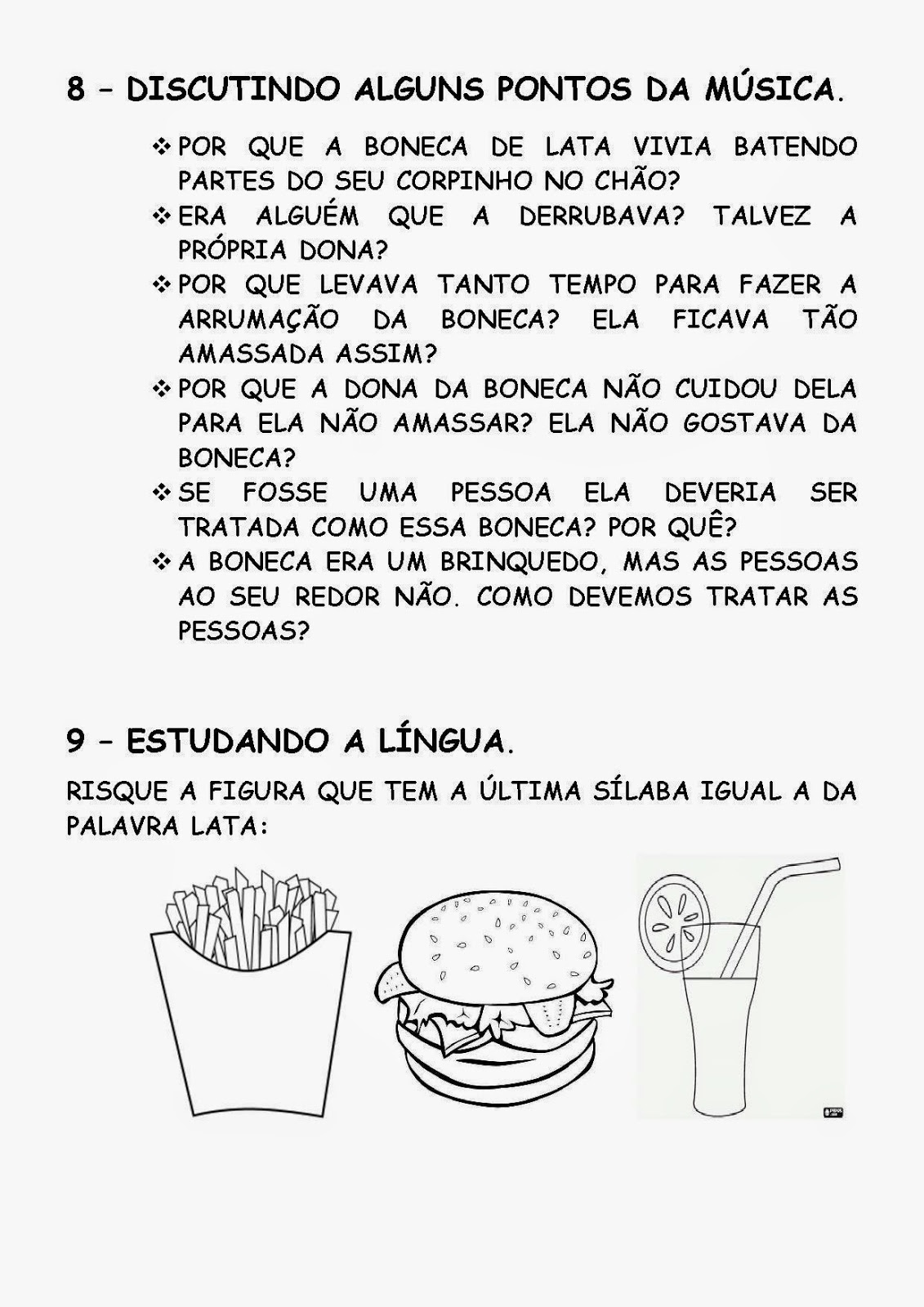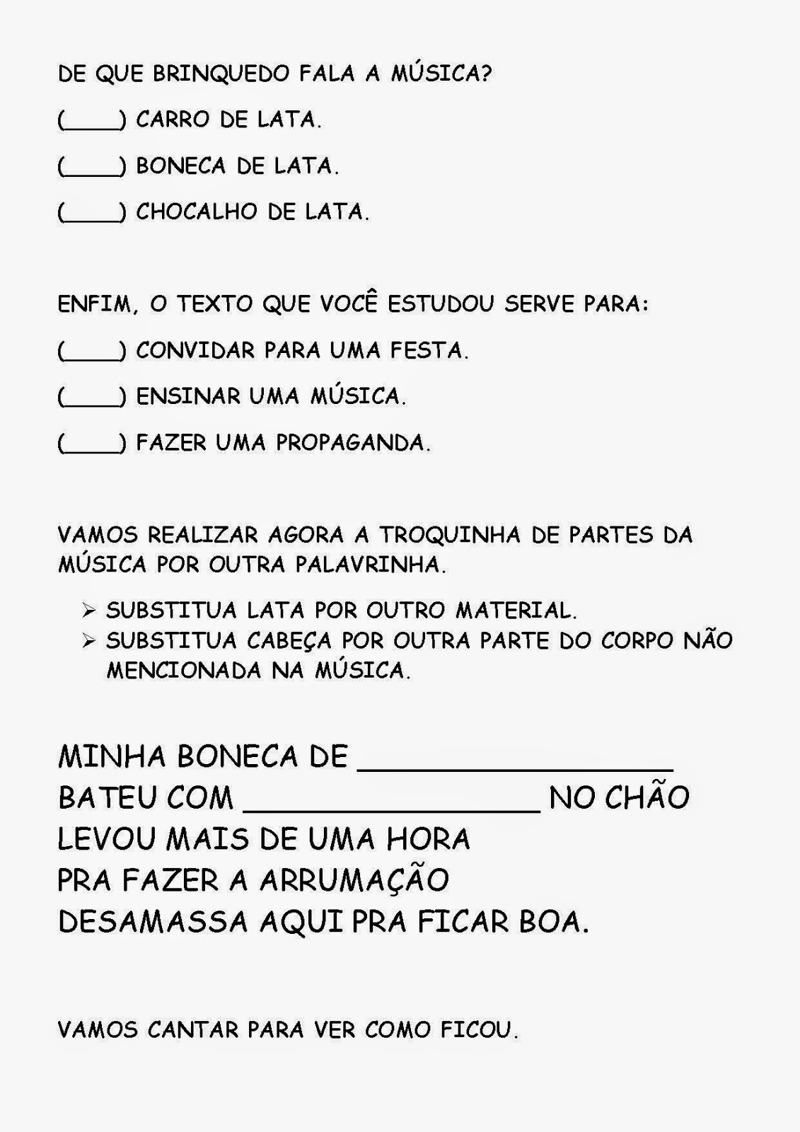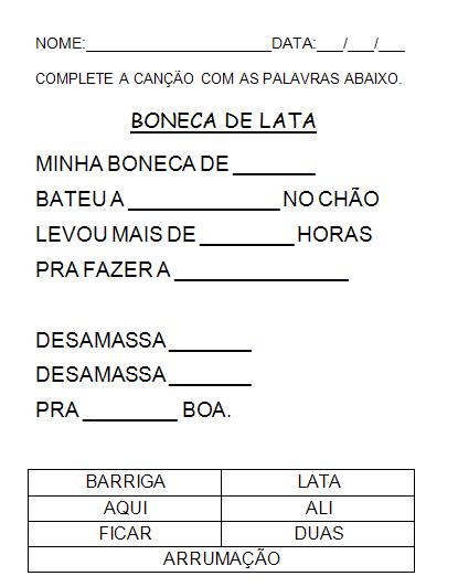 - Ouvir, cantar, ler, interpretar e representar a música BONECA DE LATA;