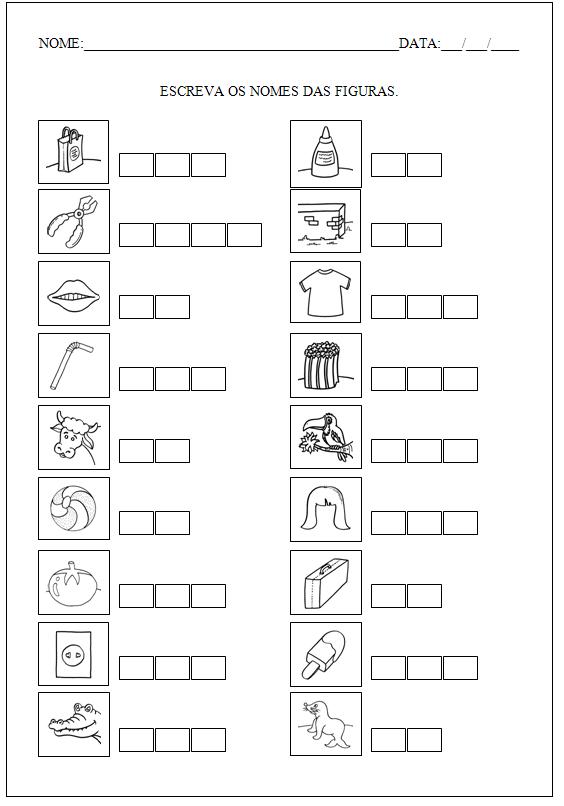 Segue algumas atividades para alfabetizar. São atividades para escrever os nomes das palavras e formar palavras a partir dos símbolos.