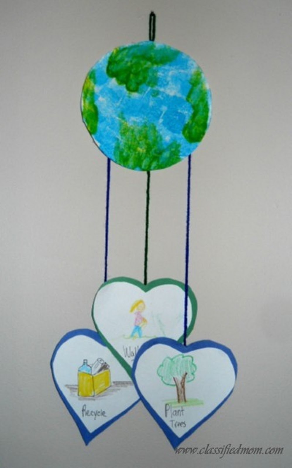 Este móbile consiste em um círculo com o formato do planeta Terra, com três corações pendurados. Em cada coração uma atitude de preservação do meio ambiente.