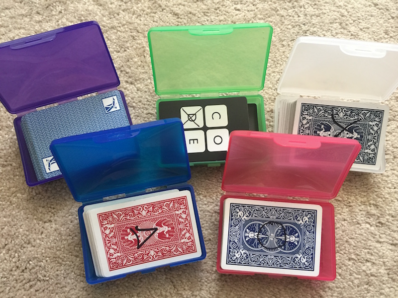 - Gosto de usar um tupperware para guardar minhas cartas. Eles têm o tamanho perfeito para guardar um baralho e são baratos. Porém, um saco plástico também funciona; só não suportam tanto peso e precisam ser substituídos com o tempo;