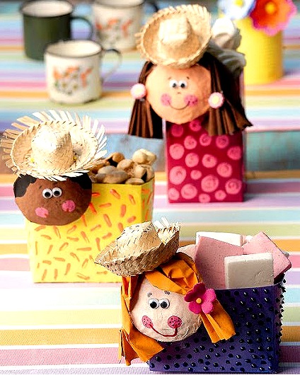 A ideia é simples e perfeita pra trabalhar durante todo o mês, criar personagens para montar a festa, expor ou para levar pra casa… pra isto você vai precisar de caixinhas, retalhos de tecidinhos, lã, papel e tudo mais que sua criatividade permitir!!!