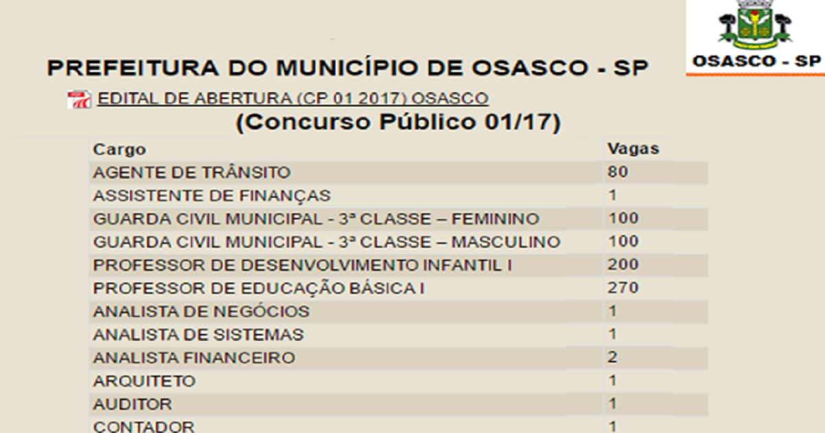 A Prefeitura do Município de Osasco, no Estado de São Paulo, dará início no dia 29 de maio de 2017, as inscrições para o Concurso Público que visa preencher 1.271 vagas para profissionais de nível médio e superior de acordo com o