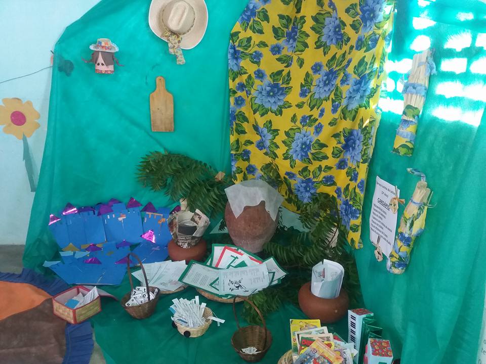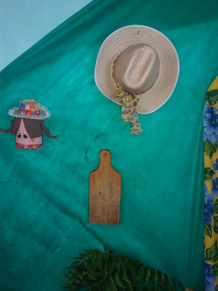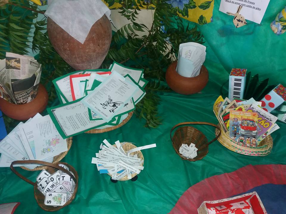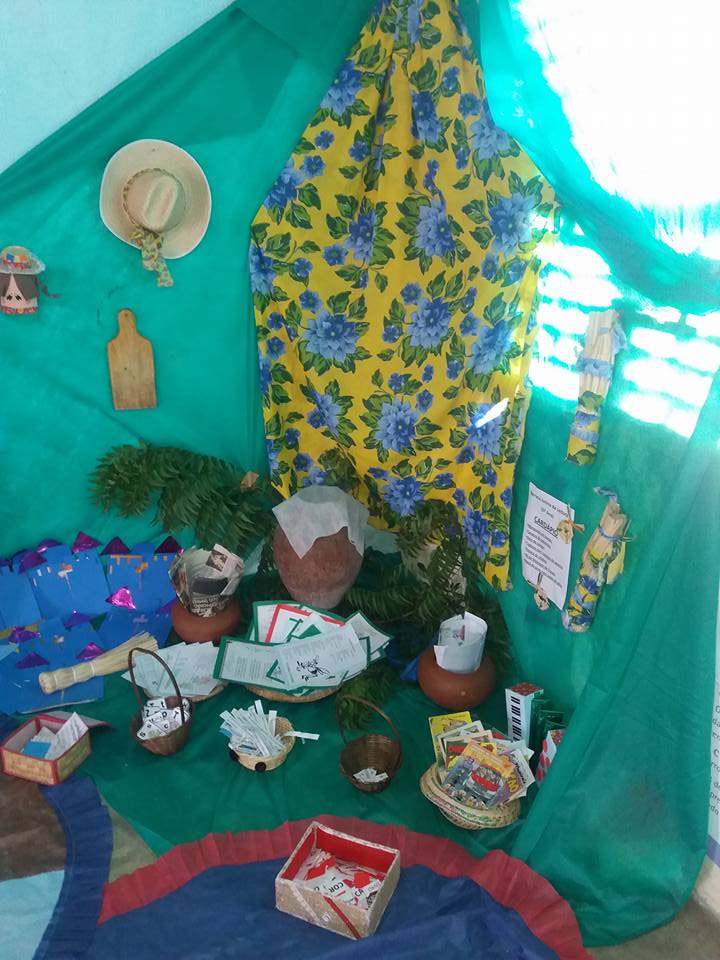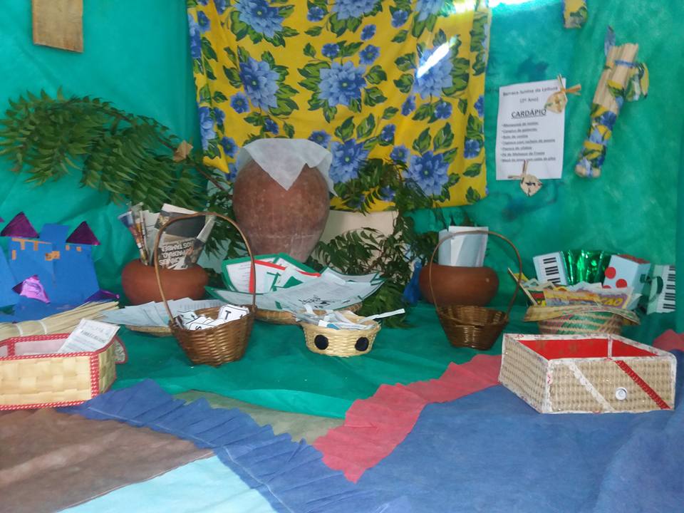 Dentro da sala com objetos relacionados à festa junina, a professora conta que organizou uma barraca improvisada com diversos tipos de textos e deixei as crianças fazerem a leitura à vontade.