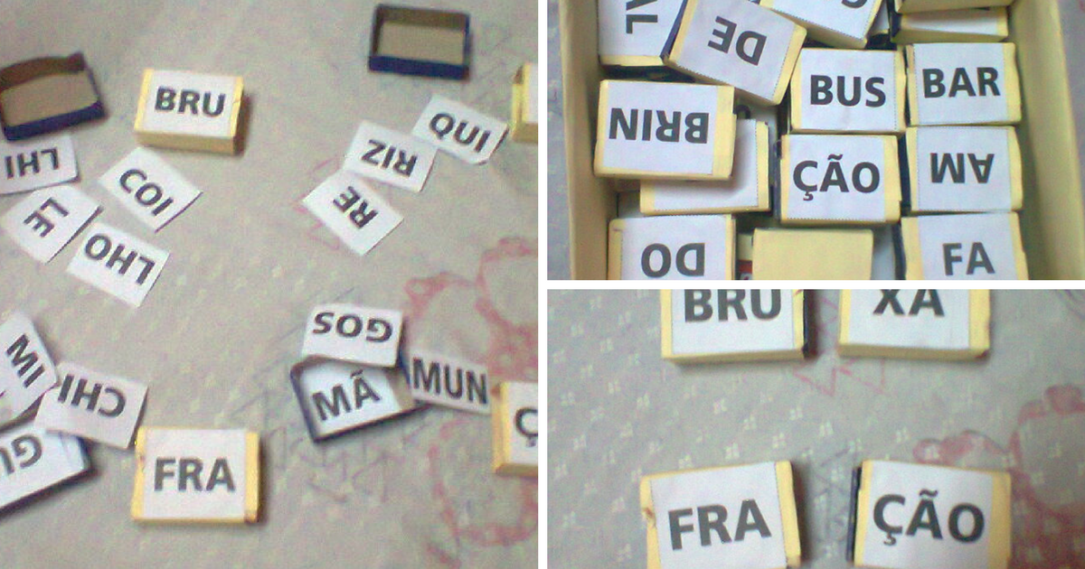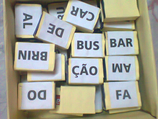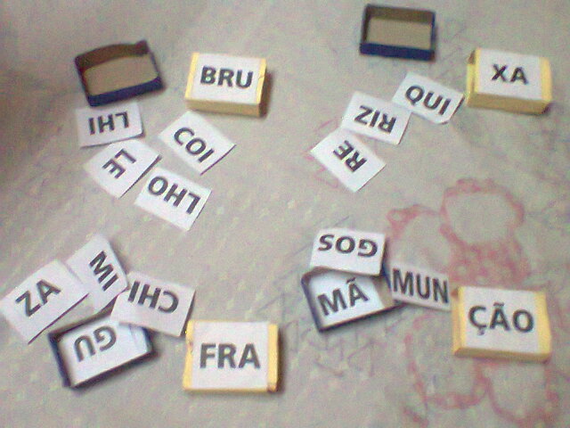 Os alunos formam palavras a partir das sílabas escondidas dentro da caixa de fósforo. Você pode dividir em grupos e formar campeonatos de palavras e ainda premiar a equipe vencedora.