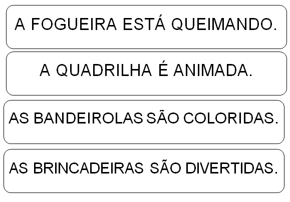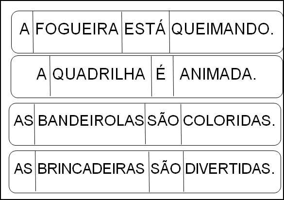 As frases lidas na roleta, estarão também fatiadas, para depois os alunos montarem a sequência correta, contar o total de palavras e compreender os espaços que há entre cada uma.