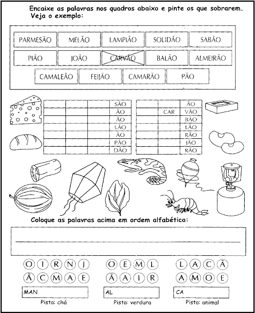 Atividades com Palavras Terminadas em ÃOColocar em ordem alfabética e descobrir palavras terminadas em ÃO.
