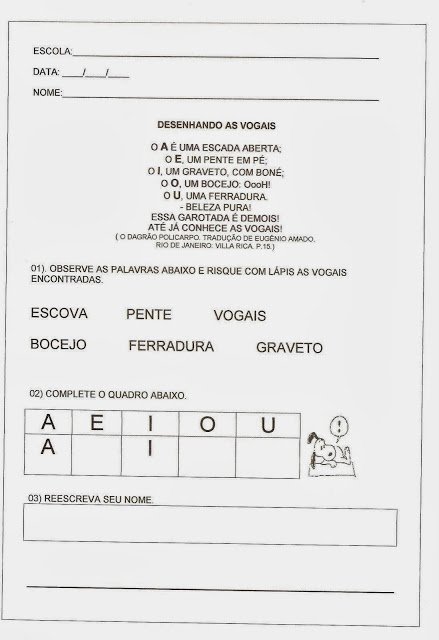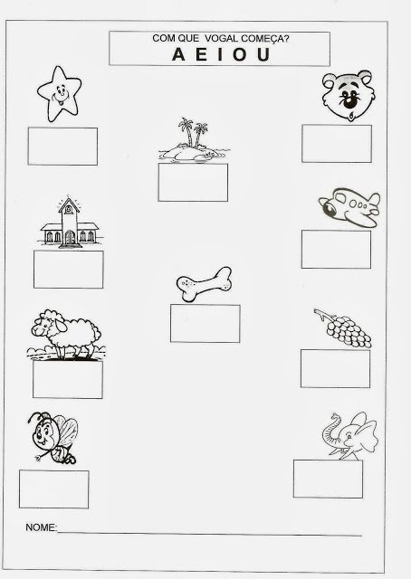 Objetivo: relembrar vogais, identificar e diferenciar vogais, criar estratégias organizacionais de tratamento de informações e escrever autonomamente palavras iniciadas por vogais.