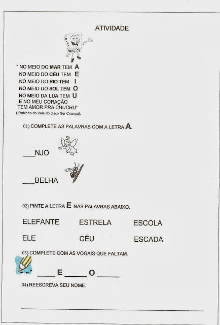 Complete as palavras com a letra, pinte a letra E, complete com vogais e escreva o seu nome.
