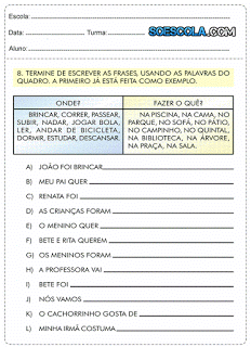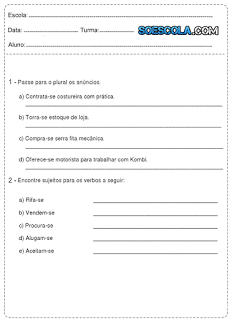 Atividades de português 5° ano para imprimir para terminar de escrever as frases, usando as palavras do quadro, passe para o plural os anúncios, encontre o sujeito para os verbos, interpretação de texto, acentuação gráfica, observe o quadro e faça a narrativa dos personagens, identifique os sujeitos próprios, comum, concreto e abstrato entre outros.