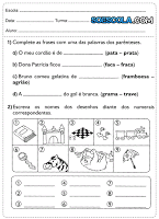 Forme substantivos comuns com 2, 3 e 4 silabas, coloque as palavras em ordem alfabética, substitua os números por silabas e forme palavras, circule no texto palavras com fl, bl, gl, pl e cl, complete com adjetivo as cruzadinhas e separe as palavras do texto em masculino e feminino.
