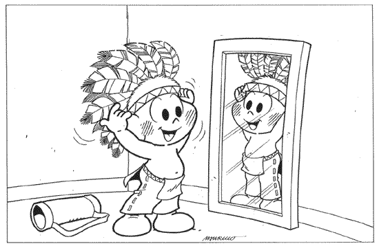 Cascão se vestindo de índio. Desenho que pode ser utilizado para elaborar alguma alguma atividade do Dia do Índio.