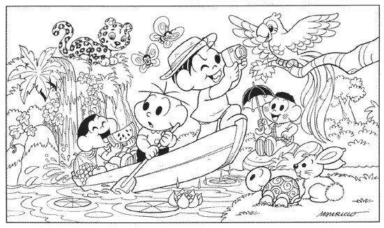Magali comendo melancia, Cebolinha remando o barco, Mônica fotografando a paisagem e Cascão com um guarda-chuva na mão. Os personagens da Turma da Mônica estão rodeados por animais no meio de uma floresta.