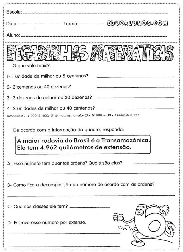 Exercícios de matemática 4° ano fundamental – Atividades sobre responda o que se pede, pegadinhas matemáticas com milhar, centena e dezena, cálculos com operações! Todas as atividades estão disponíveis para imprimir e baixar de acordo com sua necessidade de ensinamento ou aprendizado.