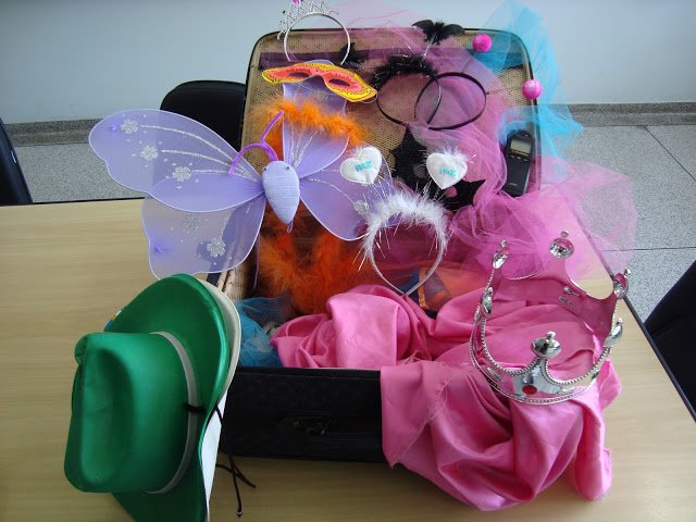 Nesta mala coloquei diversos objetos para auxiliar na “Contação de Histórias Infantis”. Nela podemos encontrar: tecidos, coroa do rei, tiara da princesa, máscaras, asa de borboleta, celulares, chapéus, varinhas, etc.