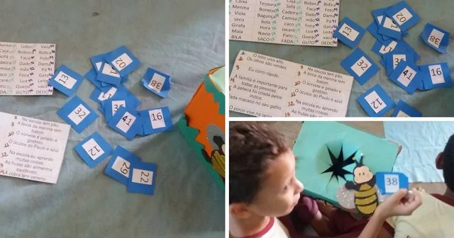 Dentro de uma caixa coloque tarjetas com números, passe a caixa pelos alunos, solicite que um por vez retire um número e dirija-se até o tabuleiro das frases e palavras e peça que realize a leitura oral.