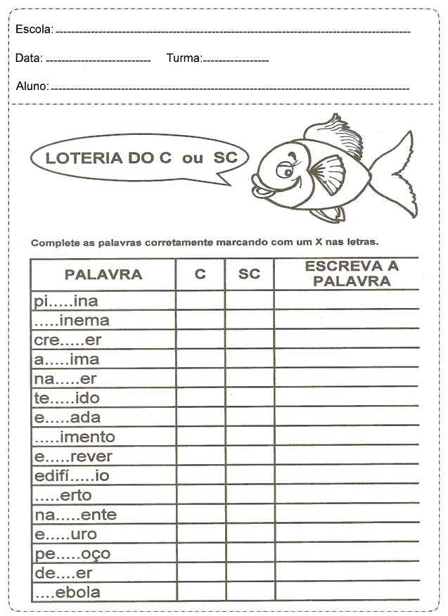 Complete as palavras corretamente usando C ou SC: Atividades para imprimir.