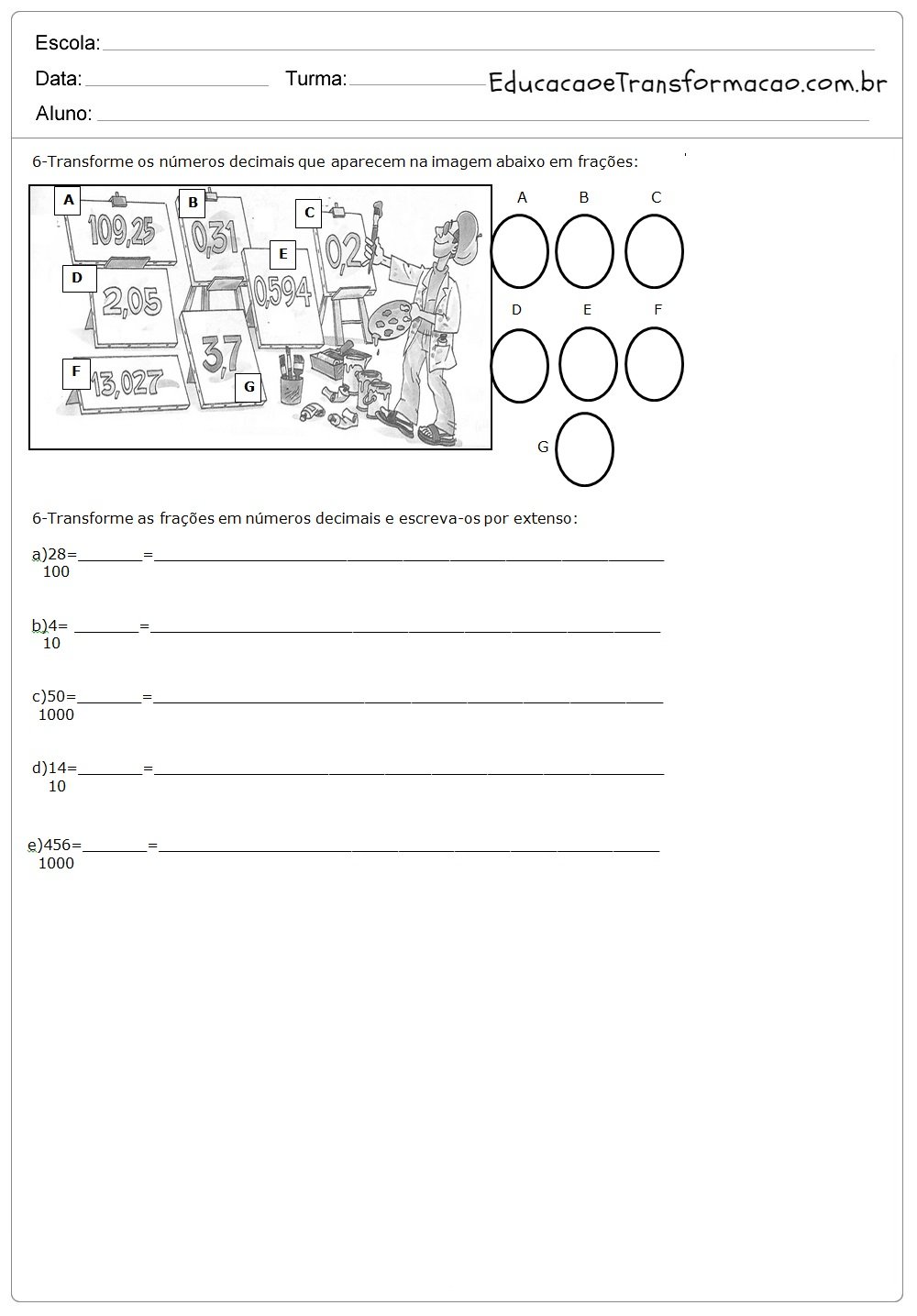 6-Transforme os números decimais que aparecem na imagem abaixo em frações: