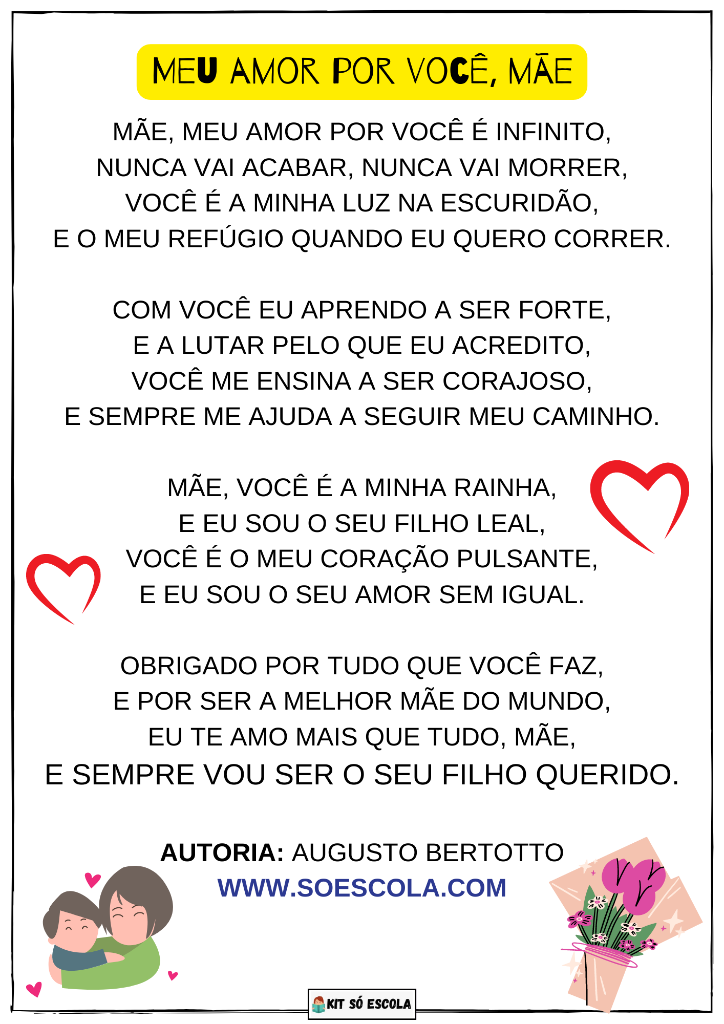 Cada poema apresenta uma perspectiva única sobre o amor materno, destacando a figura da mãe como um ser especial, amoroso e inspirador. Esses poemas podem ser utilizados em atividades pedagógicas relacionadas ao Dia das Mães, contribuindo para o desenvolvimento das habilidades linguísticas dos alunos e para a valorização dos vínculos familiares.